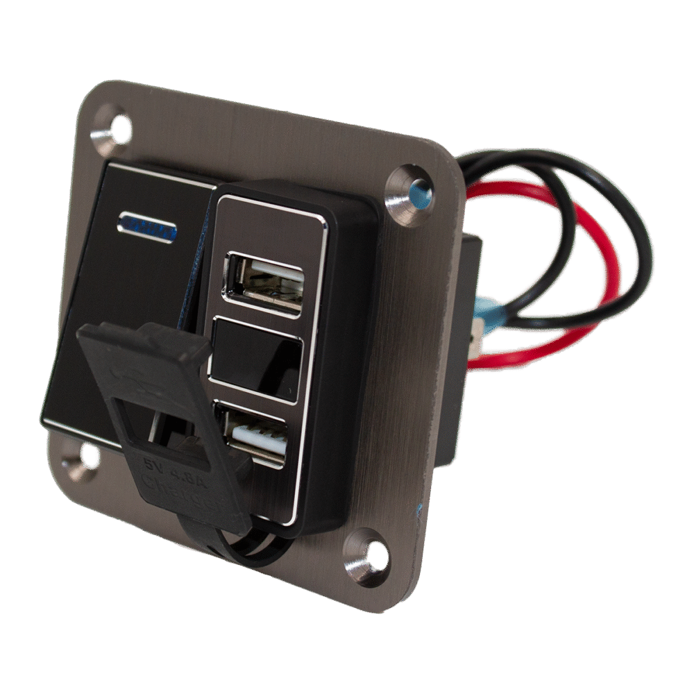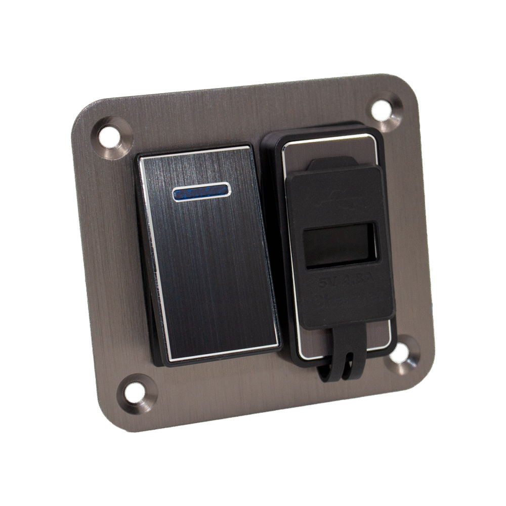 Incluye un interruptor ON/OFF con iluminación LED, que facilita el control del sistema incluso en condiciones de poca luz. Además, cuenta con dos puertos USB que permiten cargar de forma rápida y segura celulares, tablets, GPS, cámaras y otros dispositivos electrónicos mientras conduces.